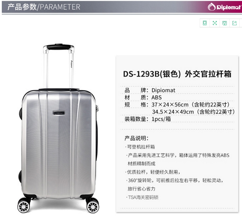 外交官diplomat產(chǎn)品經(jīng)典與創(chuàng)新,傳統(tǒng)與新潮真正讓旅行者在長途旅行中感受多樣化的心情色彩;外交官高級旅行用品采用進(jìn)口面料,特殊工藝精制而成;全新PU材質(zhì)制成大輪,具有噪音低、耐磨佳;高品質(zhì)拉鏈,具有防爆裂特性,增加旅行的安全度;多段式拉桿,能承受80公斤重壓;人性化功能設(shè)計,滿足旅途不同需求。